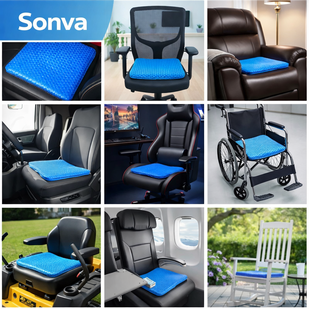 Sonva cushion adapts to every seat you use. The stable base and non-slip underside keep it secure oncar seats, office chairs, dining chairs, and wheelchairsfor everyday comfort. The gel technology contours to your body without losing shape, while the removable,machine-washable coverkeeps it fresh daily.